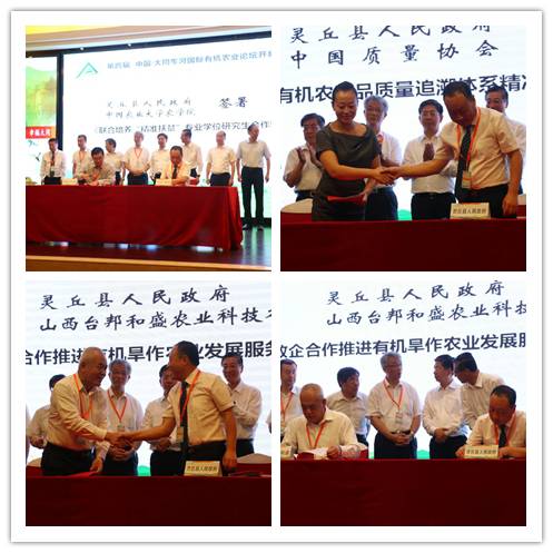 会前,中国农业大学、中国质量协会、山西台邦和盛农业科技有限公司、安晨集团分别与灵丘县人民政府签订了《联合培养“精准扶贫”专业学位研究生协议》、《有机农产品质量追溯体系精准扶贫合作战略协议》、《政企合作推进有机旱作农业发展服务脱贫攻坚战略框架协议》、《灵丘县有机农业产业精准扶贫项目战略合作协议》。